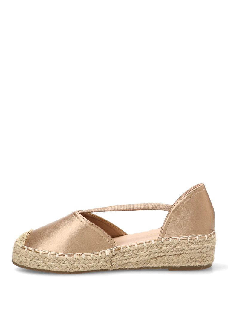 Su silueta de cuña media, trenzada con maestría artesanal, proporciona la elevación perfecta para estilizar la figura sin renunciar a la base plana y estable que caracteriza a las mejores esparteñas. La combinación del brillo dorado con la textura natural de la cuña crea un equilibrio visual perfecto entre lo urbano y lo tradicional.