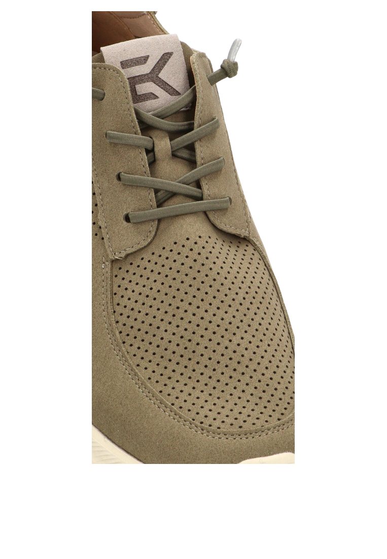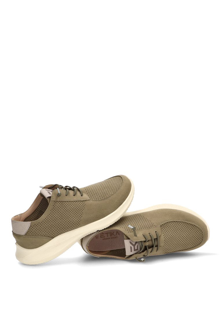 El modelo Alcanada 01 de ETIKA destaca por su avanzado diseño calador en el empeine, una solución inteligente para el hombre activo que no está dispuesto a sacrificar la frescura por el estilo. Este troquelado permite que el pie respire libremente, convirtiéndolo en el calzado ideal para jornadas intensas o climas templados. El color Kakhi añade una capa de sofisticación relajada, siendo un neutro con carácter que combina magistralmente con tonos arena, vaqueros oscuros o colores tierra.